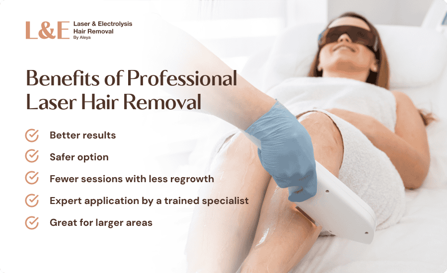 At-home devices can work, but they’re slower and less effective, especially on coarse or stubborn hair.