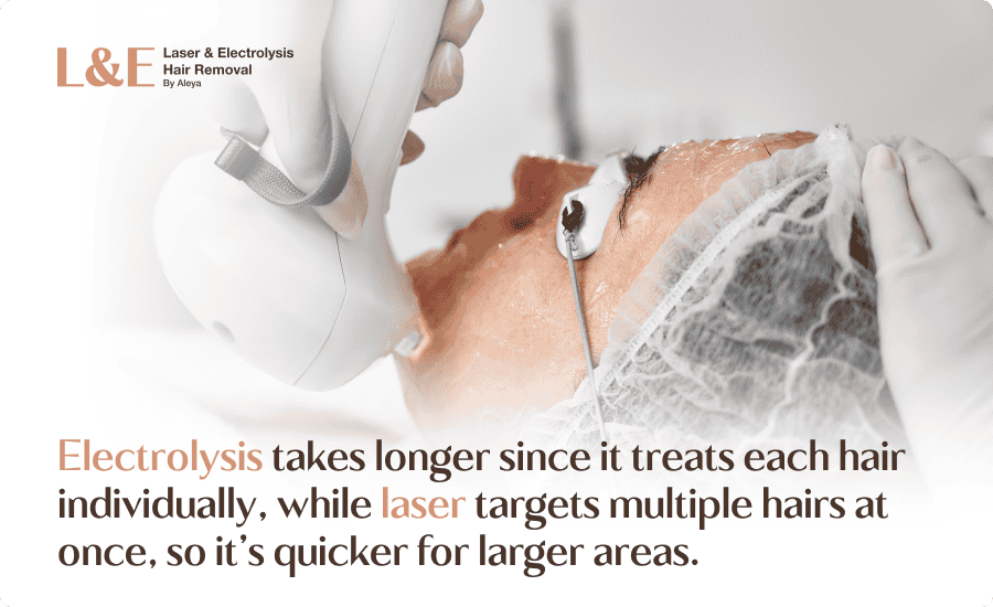 - You’re not an ideal candidate for electrolysis or prefer less frequent visits. Laser requires fewer sessions overall, especially for large areas.